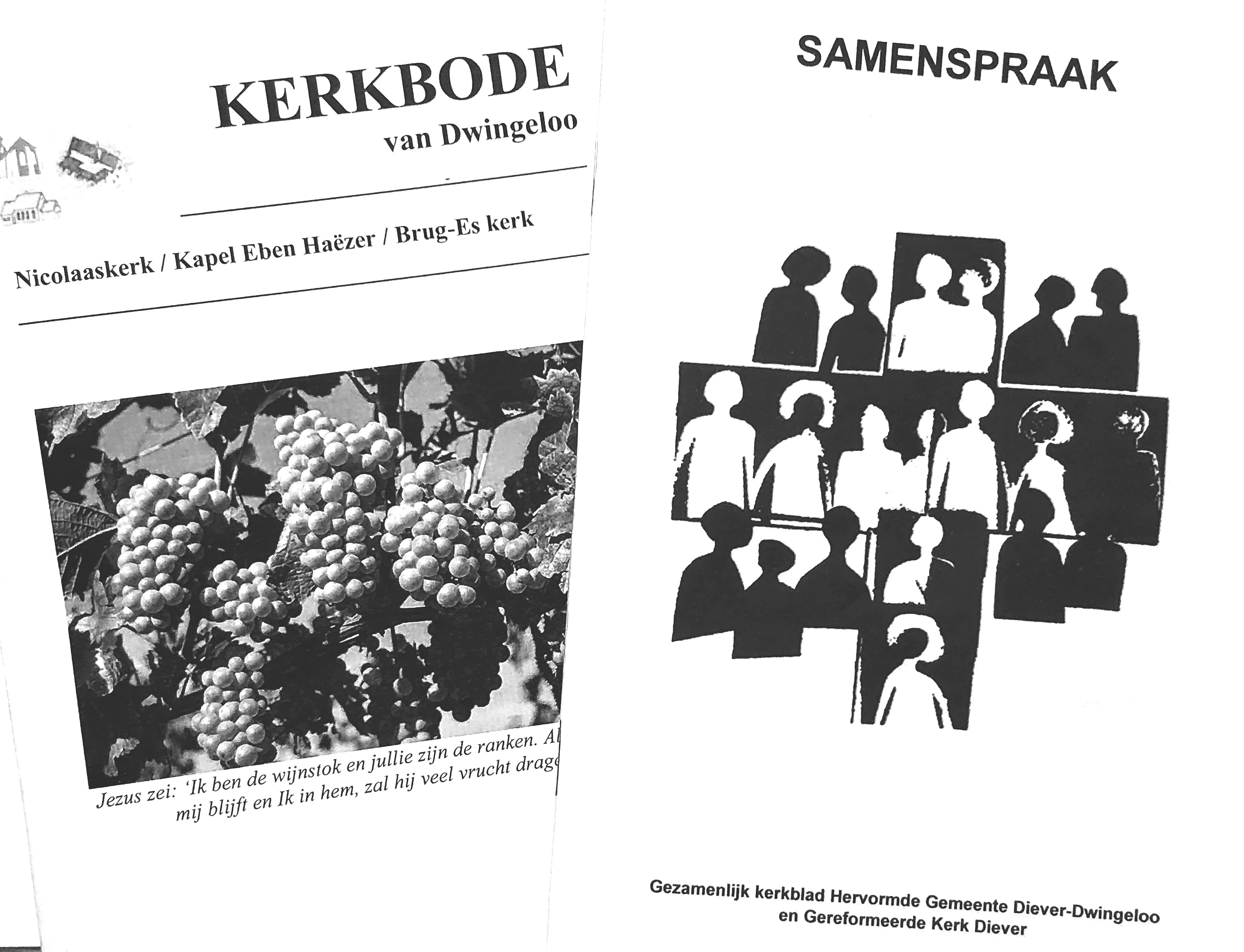 ![]() Maandelijks verschijnt 'Samenspraak' in Diever en de 'Kerkbode' in Dwingeloo. Hierin vindt u informatie vanuit beide kerken over kerkdiensten, activiteiten, het wel en wee in en van de gemeente, speciale projecten ect. Lees meer>> |