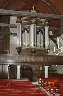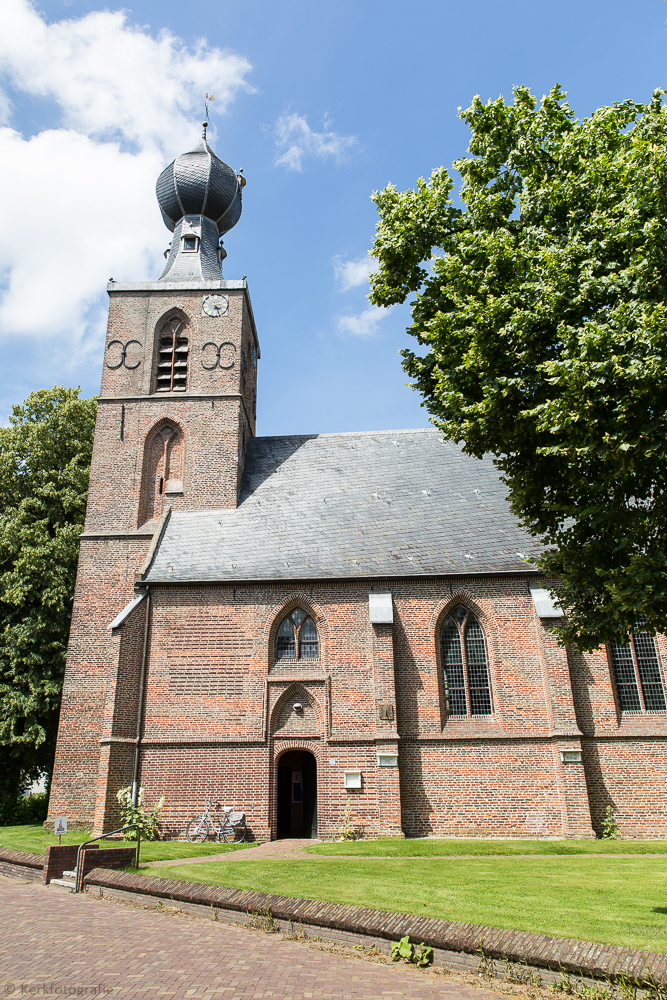 De Sint Nicolaas of Nederlands Hervormde kerk staat op de zuidoosthoek van de Brug-es. Deze bakstenen, gotische, zaalkerk is gebouwd omstreeks 1410 op de plaats van een ouder kerkje uit de 12e eeuw. Het schip is éénbeukig en geeft aan de noordzijde toegang tot een aanbouw, de zogenaamde Sint Maartenskapel. Vanaf 1410 tot de reformatie (1598) stond hier het altaar van het Sint Maartenvicarie. De collator was de bezitter van het huis Entinge. Tussen 1640 en 1669 en van 1725 tot ca. 1777 was de kapel in eigendom van de heren van Batinge. Sindsdien behoort het toe aan de erfgenamen van de havezate Oldengaerde. Zij hebben er tevens een eigen herengestoelte, de z.g. “van Oldengaord’ns baank”. Omdat de kapel enige malen behoorde aan de heren van Batinge wordt hij in de volksmond ook wel genoemd naar deze havezate. Drie andere vicariealtaren in de kerk waren gewijd aan Onze-Lieve-Vrouwe (1382), Het Heilig Kruis en Sint Catharina, waarvan de laatste verbonden was aan de kosterij. De koster van Dwingeloo was tevens schoolmeester en vanaf 1665 ook organist.Het versmalde overwelfde koor eindigt met een driezijde apsis. In het muurwerk aan de noordelijke buitenzijde bevinden zich nog restanten van een sacristie. De profiellijsten van de dichtgemetselde toegang waren nog tot 1924 nog aanwezig. Tegenwoordig verraadt alleen de kleur van de nieuwe bakstenen de plaats van de verdwenen deur. In het koor bevindt zich de grafkelder van het huis Batinge. Onder het gestoelte in de kapel ligt de begraafplaats van de familie Van Westerholt tot Entinge. ![]() In 1923 trof een grote brand de kerk, alleen de muren bleven overeind. De bekende en markante ui-vormige torenspits uit 1631 ging hierbij ook verloren. Een iets minder ranke kopie kwam ervoor in de plaats en is tegenwoordig het baken van Dwingeloo. Het interieur bevat o.a. de preekstoel, vervaardigd door R. Marissen en J. Bakker, een grafzerk uit 1600 van Elisabeth van Echten, wapenstenen en portretten van het echtpaar Rutger van de Boetzelaer en Batina van Lohn. Oorspronkelijk waren de portretten gevat in de luiken van een orgel dat door dit echtpaar aan de kerk in 1665 werd geschonken. Het tongewelf is beschilderd in art-deco stijl door de schilder J.K. Homan uit Smilde naar een ontwerp van L.A. Kortenhorst, tekenleraar te Assen. De binnenmuren zijn tijdens de restauratie 1923-’25 ontdaan van de witte bepleistering, waardoor het interieur nogal een sober karakter heeft gekregen. Het collatierecht van de kerk behoorde aan de eigenaar van Batinge. Nog in 1915 is door de erfgename ervan ds. De Boer tot predikant benoemd. | ||